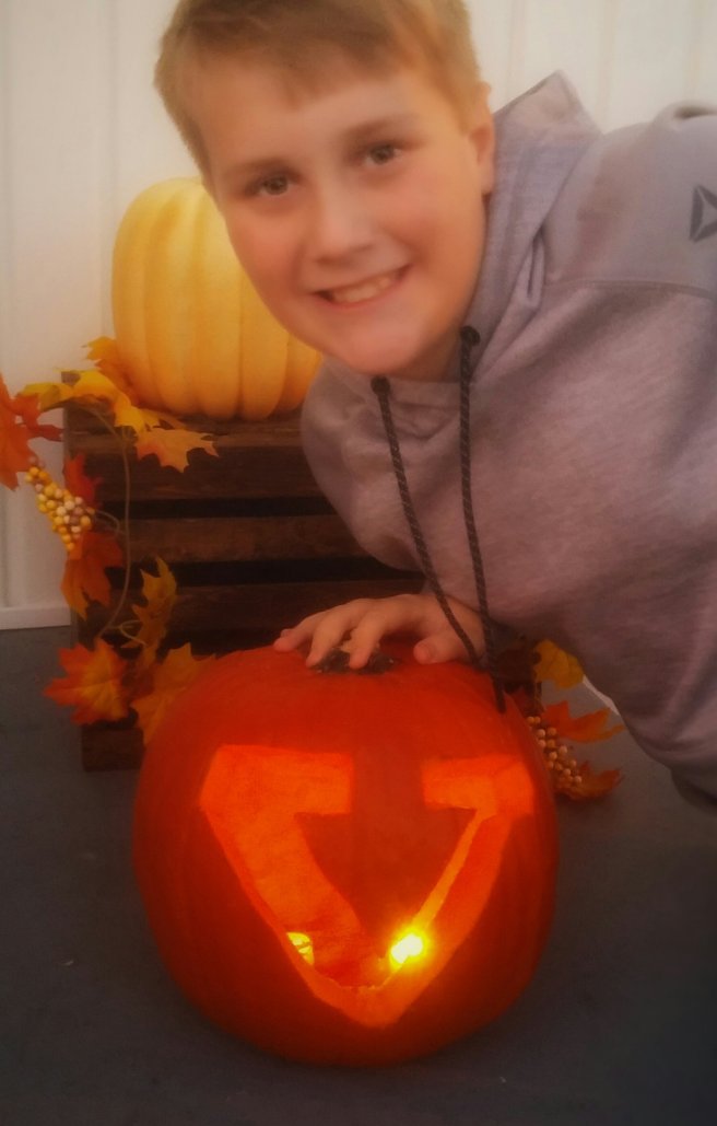 Kylan carved his pumpkin. He wanted to do the high school football team logo, which is also the logo for the junior football team he played for this season.