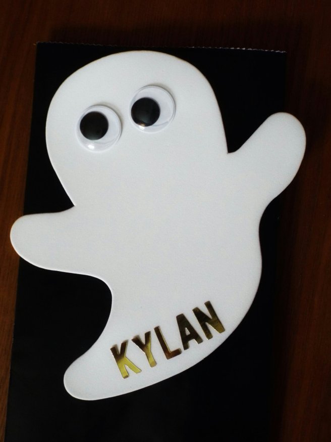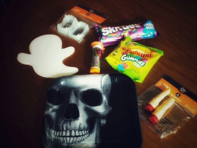 The only purchases I made were Halloween plates for .98 cents at Wal-Mart, a pack of 4 creepy finger bubbles and a pack of 8 vampire fangs, which were only $1 per pack at Target, along with some of their favorite candy. The small bags were .88 cents at Wal-Mart and I made the ghosts with googly eyes and stickers that I already had. I put together this small goody bag for less than $6.