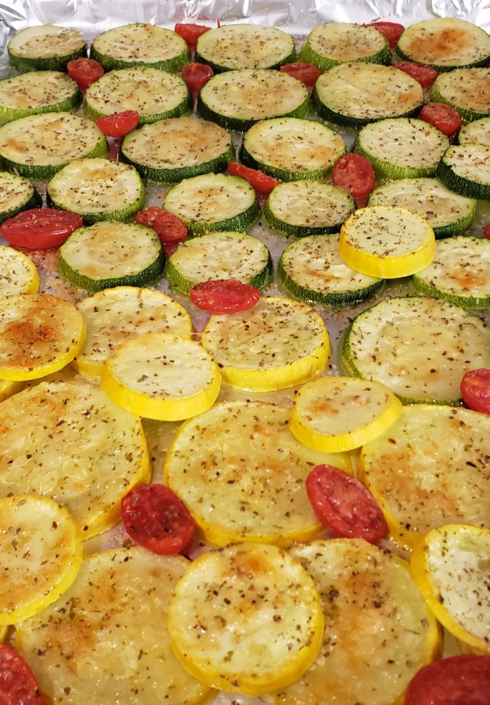 When I make these vegetables, the first thing I do is preheat the oven to 400 degrees and line a baking sheet with aluminum foil. Then, I wash off and slice our vegetables. Once I’ve laid them on the baking sheet I drizzle them with olive oil. I sprinkle them with Italian and garlic seasoning. I also add salt, pepper, and top them off with parmesan cheese. You can use shredded, but I’ve also used grated and they turn out just as delicious. Put the vegetables in the oven for 20-25 minutes or until golden brown.