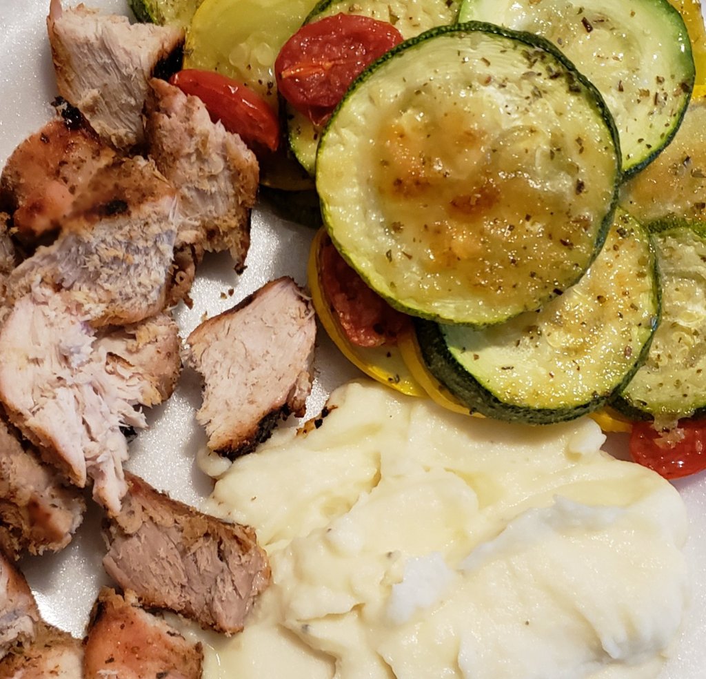 I love this time of year. We’re constantly grilling and gathered out on the patio while we watch the kids play in the yard. Three times this week we’ve had zucchini, squash, and tomatoes that we bought from Aldi’s.